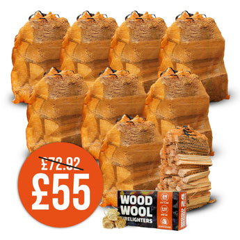 Find exceptional value in our Kiln Dried Hardwood Winter Warmer bundle! Get everything you need to keep your home warm this winter, including 8 bags of our Kiln Dried Oak Hardwood Logs, a net of Kiln Dried Kindling & a 24 piece of Wood Wool Firelighters.